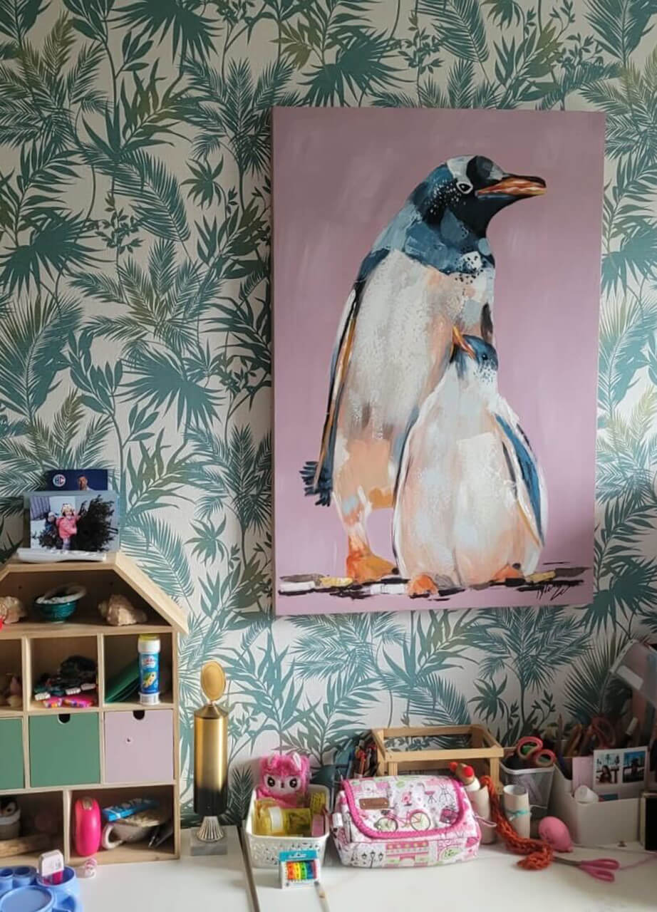 Les pingouins peints à la main sur la peinture acrylique 'Arctic Native' donnent d'une part une image amusante, mais ont d'autre part un effet adorable grâce à leur familiarité - la décoration murale idéale pour une chambre d'enfant. En rose et bleu, qui se transforme par endroits en gris-bleu, ces animaux en queue de pingouin attirent les regards de manière colorée et font plaisir à voir.