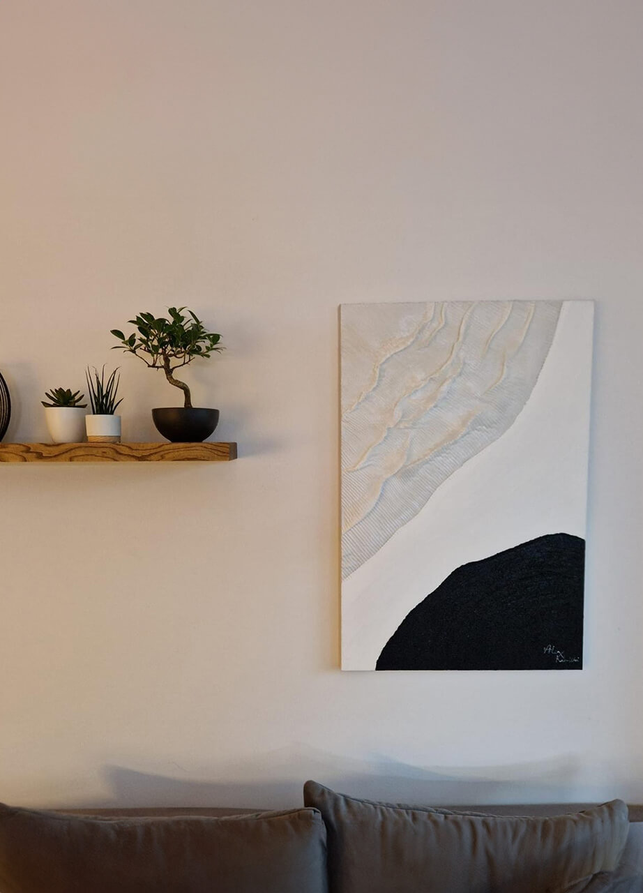 Le tableau séduit par sa structure tridimensionnelle. Au début, nous étions un peu sceptiques, mais depuis qu'il est accroché au mur, nous sommes totalement enthousiastes. Cette particularité confère au motif très minimaliste un petit quelque chose en plus. C'est toujours un plaisir !