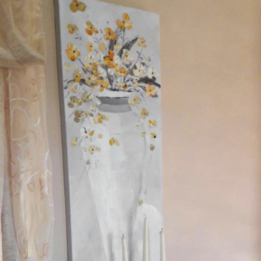 Auf Ihrem handgemalten Leinwandbild 'Sanftmut der Natur' steht eine weiße Blumenvase aus massivem Stein im Fokus, in deren Öffnung gelbe Blüten gedeihen. Sie ranken sich über die Kanten und zeigen, dass die wilde Natur sich nicht zähmen lässt und dennoch durch sanfte Ästhetik besticht. Bezaubern Sie Besucher mit diesem Gemälde in Ihrem Flur! Ihr handgemaltes Gemälde erhalten Sie in der Größe 40x120cm. Anders als bei minderwertigen Drucken auf Leinwand können Sie auf unseren Unikaten jeden Pinselstrich fühlen. 0 Canvas pictures 1 Acrylgemälde Handmade Quality 2 2 0
