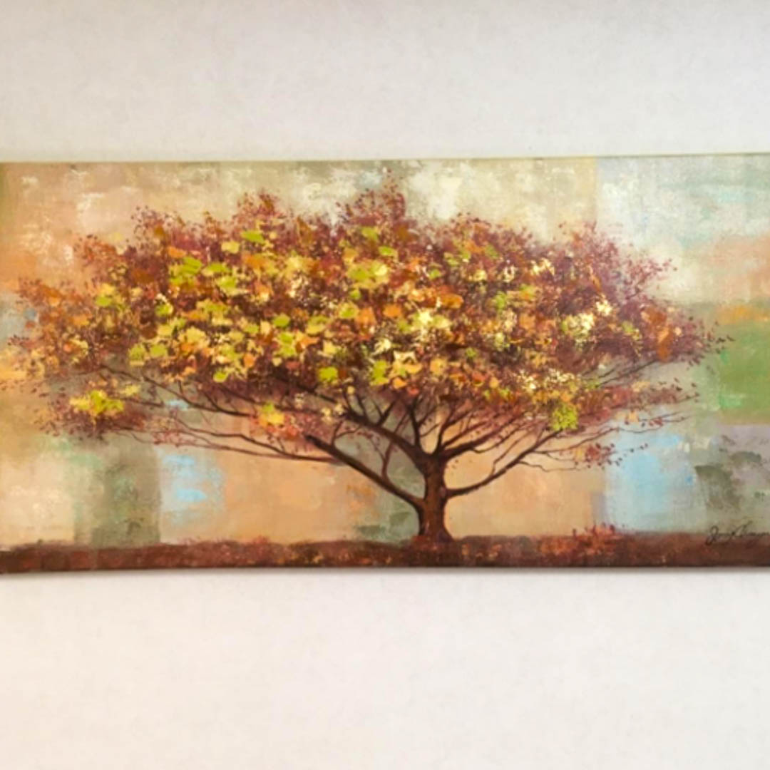 Ce magnifique arbre pousse au milieu de 'No Man's Land' et son feuillage brun est particulièrement attrayant, ce qui est souligné par le fond vert-beige. Il ne faudra pas longtemps pour que les feuilles d'automne tombent des branches vers le sol avant que le cycle ne recommence au printemps. Les couleurs de l'automne et la subtile brillance dorée réchauffent les esprits dans votre salon.